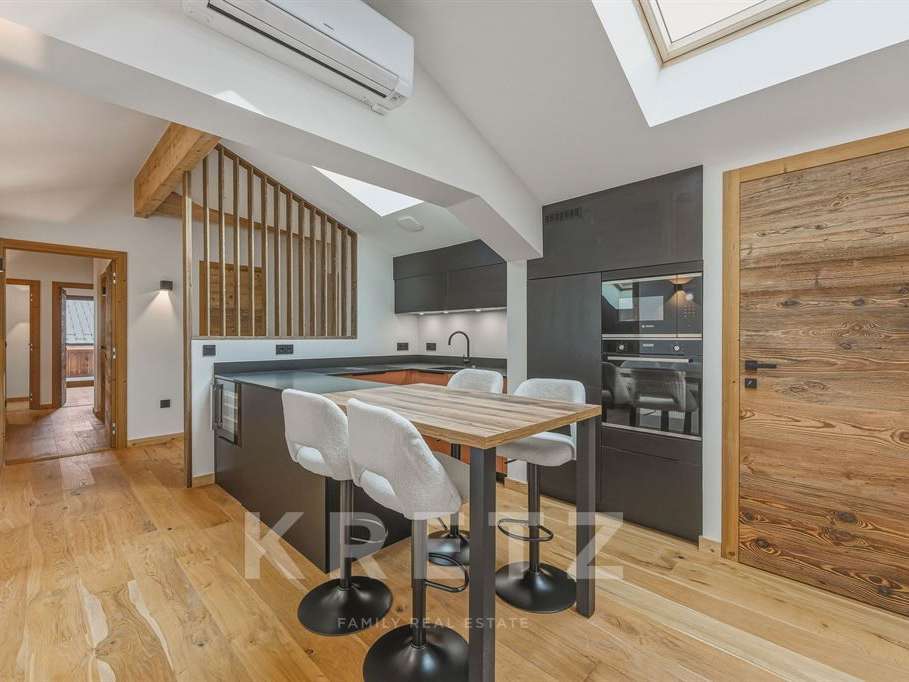The living space is bathed in natural light and opens onto a large south-facing terrace and two balconies, offering breathtaking panoramic views of the mountains.