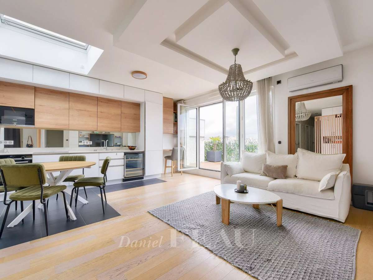 It includes a spacious living/reception room bathed in sunshine, an open-plan kitchen (all opening onto a 13 sqm terrace enjoying a view of the Eiffel Tower), a master suite with a shower room/wc and bespoke storage space, three further bedrooms, a bathroom and a separate wc.