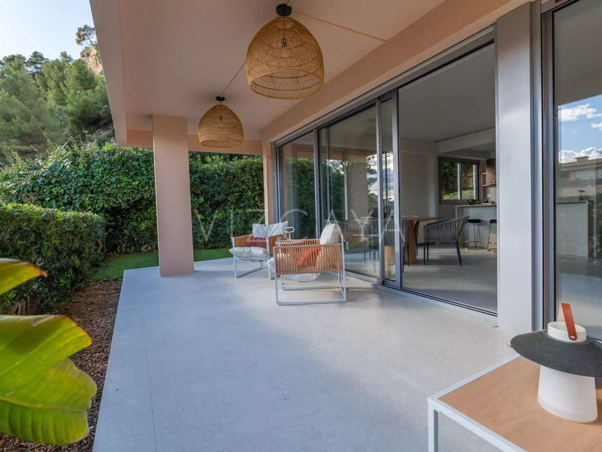Bathed in light thanks to its large windows, the property benefits from a glimpse of the sea, a landscaped garden with Mediterranean plants, and an elegant, modern atmosphere.