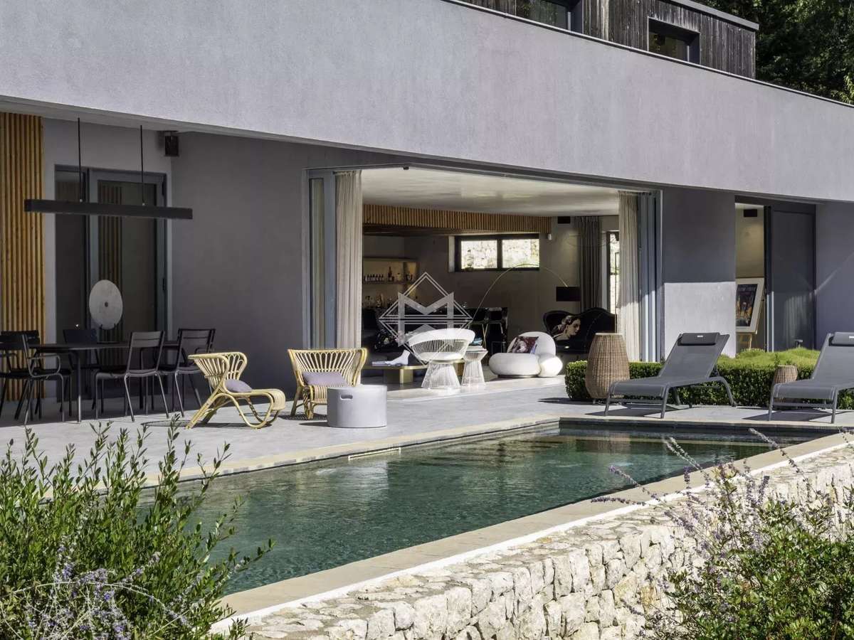 At the foot of the village of Valbonne, nestled in a preserved haven of greenery, this exceptional contemporary architect-designed home masterfully blends modern design, tranquility, and nature.
