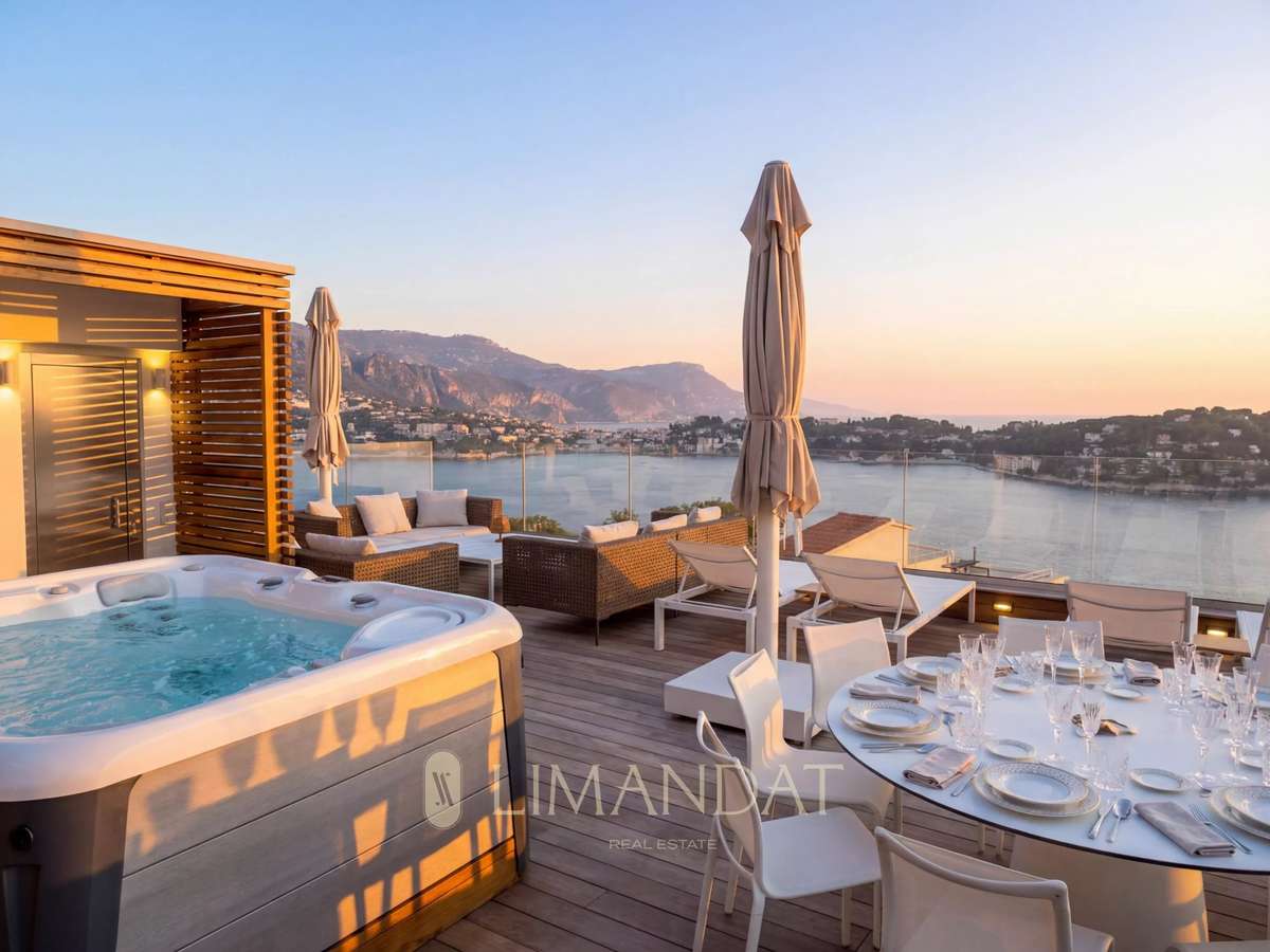 Les terrasses multiples, les espaces lounge et la piscine créent une atmosphère de détente parfaite pour profiter du climat méditerranéen.Rez-de-chaussée :– Entrée– GarageÉtage 1 :– Séjour/Cuisine– Salon avec TV– Toilettes invitées– Chambre 1– Salle de douche– Grande terrasse– Accès piscineÉtage 2 :– Chambre 2 en suite avec salle de douche et WC– Chambre 3– Dressing– Salle de bain avec douche et baignoire– WC indépendantsÉtage 3 :– Rooftop avec jacuzzi– Cuisine extérieureExtérieurs :– Multiples terrasses– Toit-terrasse– Piscine– Espaces lounge– JacuzziPrestations supplémentaires : Climatisation, barbecue, éclairages extérieurs, vidéophone, alarme, fibre optique, garage, ascenseur, jacuzzi, piscine.Location longue durée 12 mois : 13 700 euros par moisL’estimation des dépenses énergétiques en 2021 se situe entre 780 € et 1110€ par an.Les informations sur les risques auxquels ce bien est exposé sont disponibles sur le site Géorisques : La villa est louée exclusivement meublée selon un bail du Code civil, en tant que résidence secondaire ou location par une société