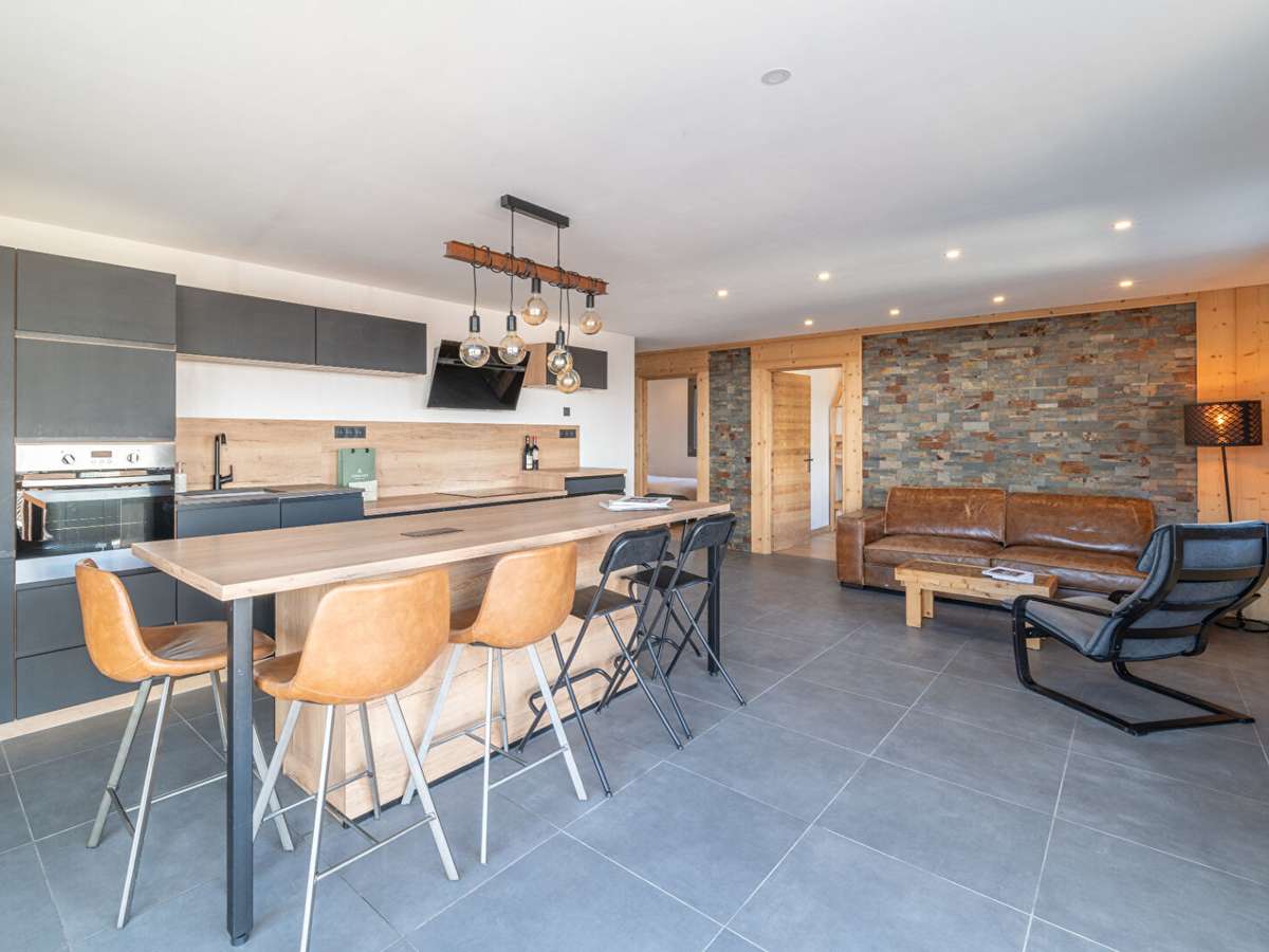 À l'extérieur, une grande terrasse de plus de 25 m² constitue un véritable espace de vie supplémentaire, idéal pour profiter pleinement de la vue dégagée et de l'environnement montagnard en toute saison.