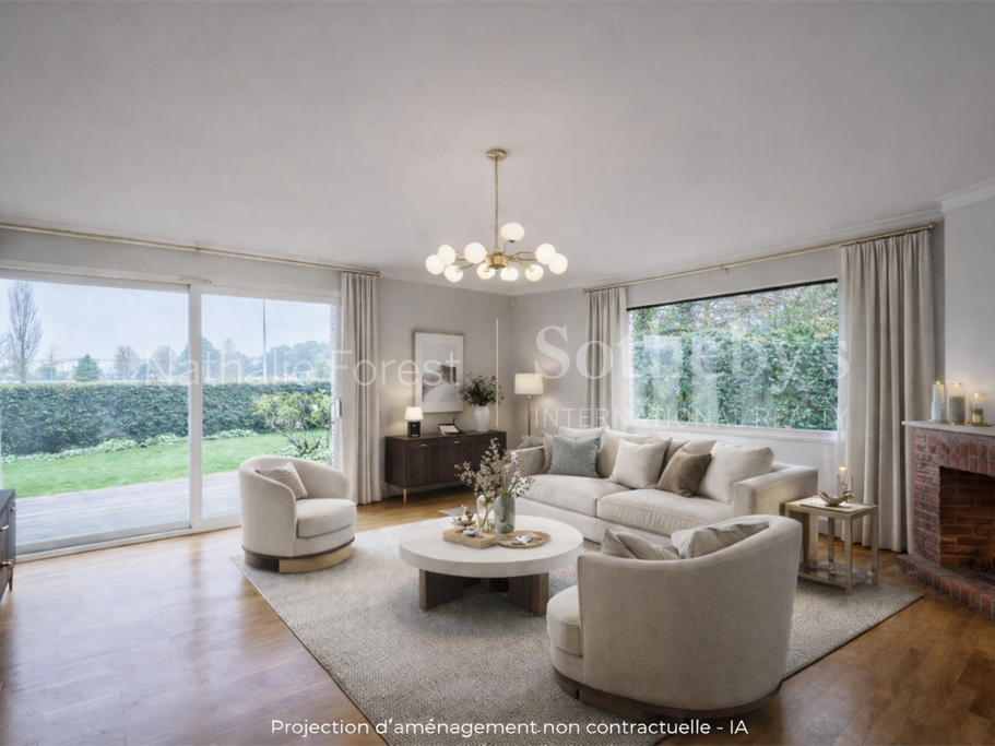 Entièrement parqueté, il bénéficie d’une cheminée à foyer ouvert et s’ouvre généreusement sur un jardin privatif d’environ 400 m², offrant une vue imprenable sur l’hippodrome.