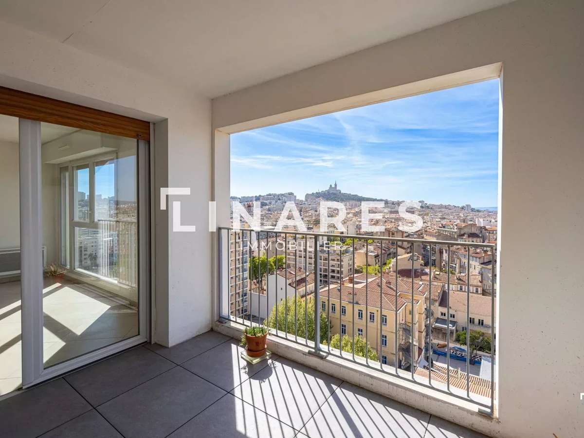 Llinares Immobilier vous propose : CITY VIEW, un appartement T3/4 de 84m² au 12ᵉ et dernier étage, bénéficiant d’une triple exposition est-sud-ouest et d’une terrasse de 10 m² offrant une vue panoramique exceptionnelle sur la ville, du stade Vélodrome jusqu'à l’Estaque, dans le quartier prisé de Castellane, au sein d'une résidence contemporaine, signée par le cabinet d’architectes Carta & Associés.