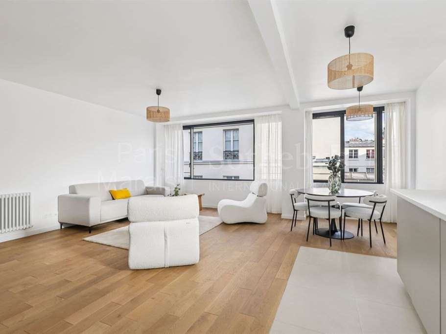 Baigné de lumière grâce à de larges baies vitrées, l’appartement bénéficie de vues dégagées sur les toits de Paris et séduit par ses prestations haut de gamme.