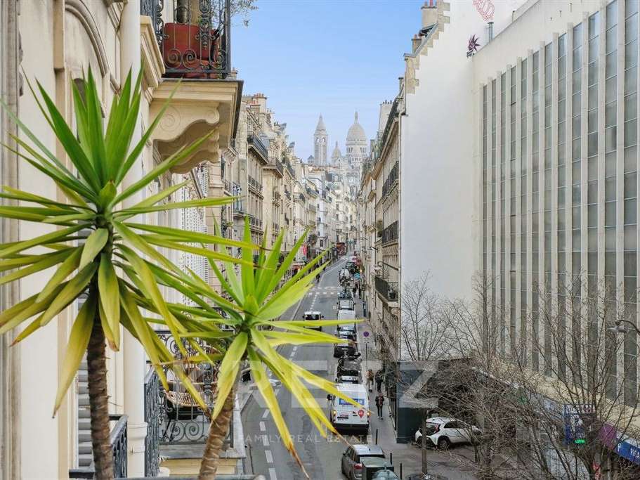 Traversant et baigné de lumière grâce à sa triple exposition, il bénéficie d’une orientation sud-est côté réception et d’un agréable balcon offrant des vues dégagées sur le Sacré-Cœur et le clocher de l’église de la Trinité.