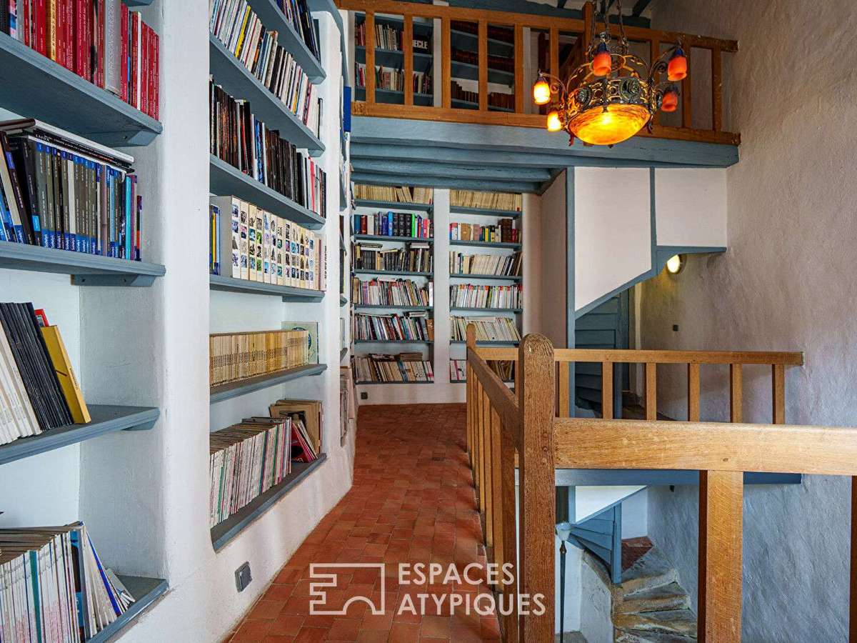 L'une offre un logement composé d'une cuisine, d'une salle d'eau, de deux chambres et d'un bureau, tandis que l'autre accueille une splendide bibliothèque sur trois niveaux, un bureau, ainsi qu'une pièce aménageable.