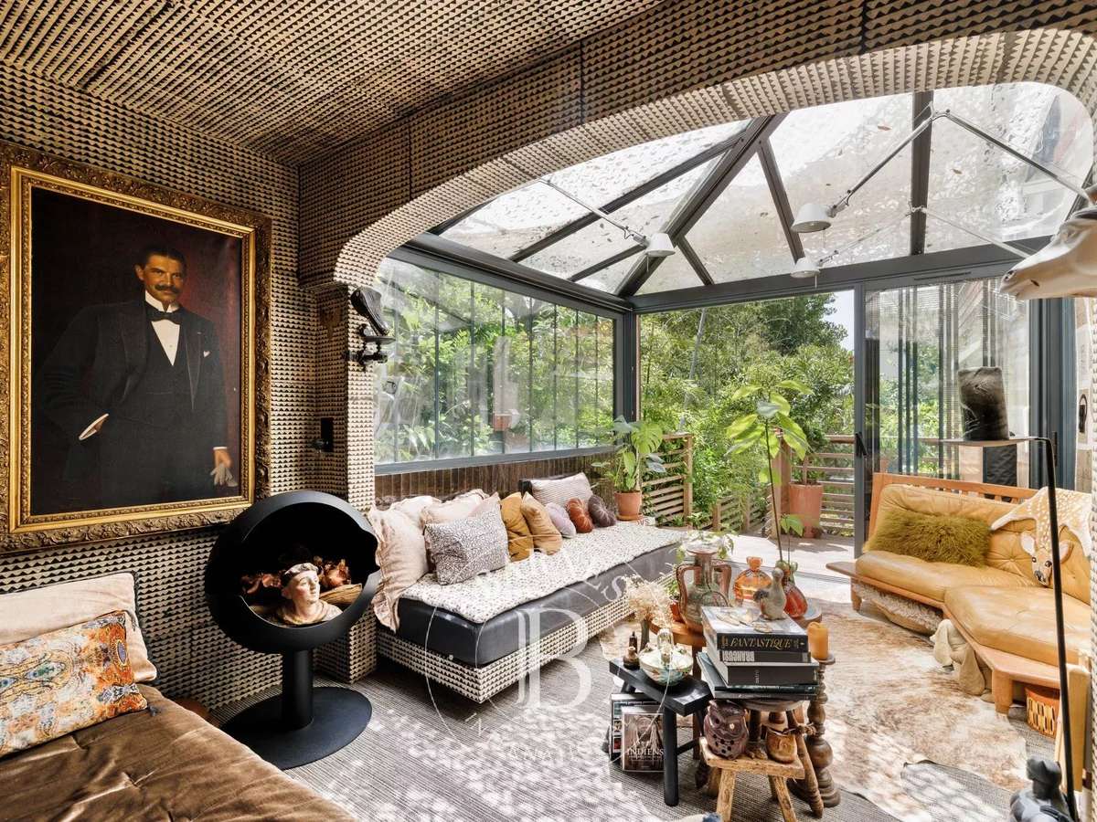 - Cuisine ouverte et véranda lumineuse sur un jardin verdoyant.