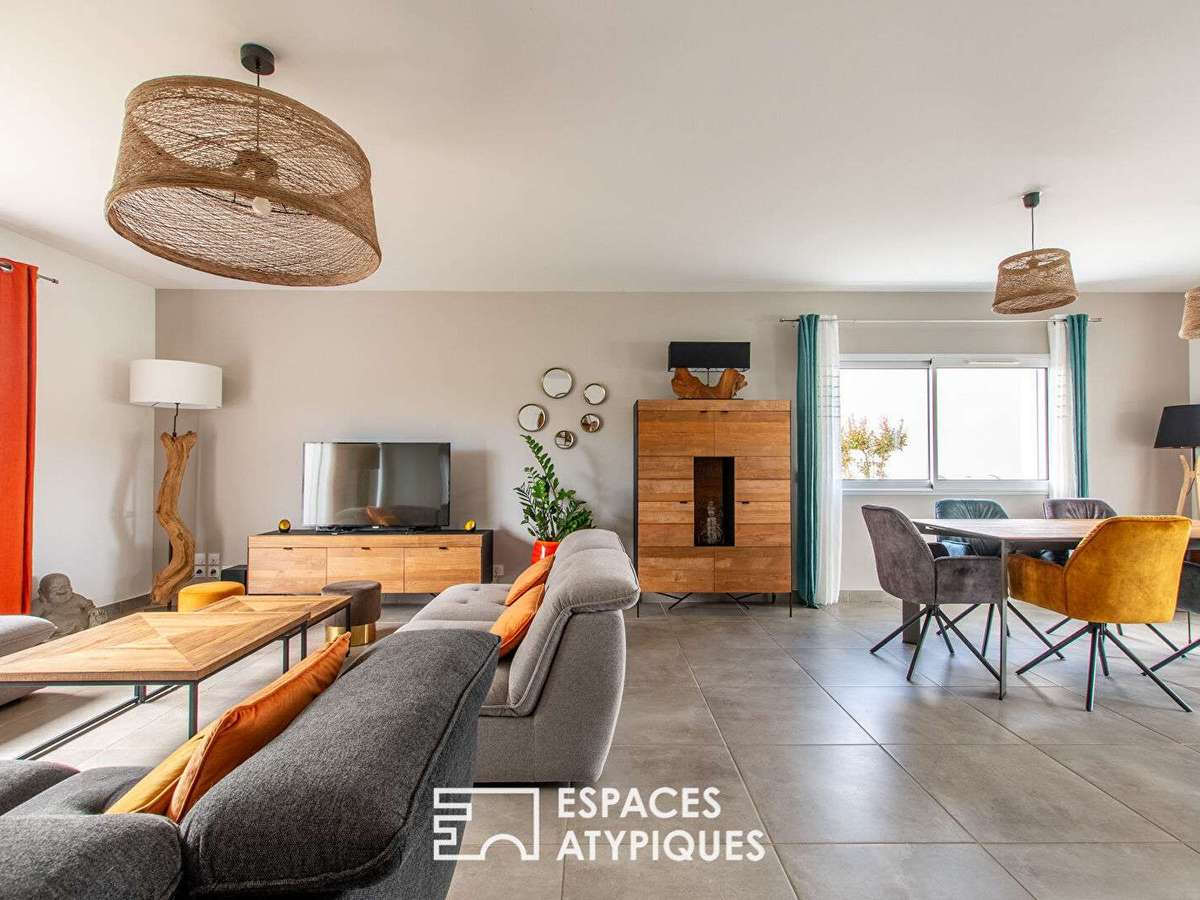 Cette demeure s'ouvre sur un vaste séjour qui comprend une élégante pièce à vivre et une cuisine moderne.