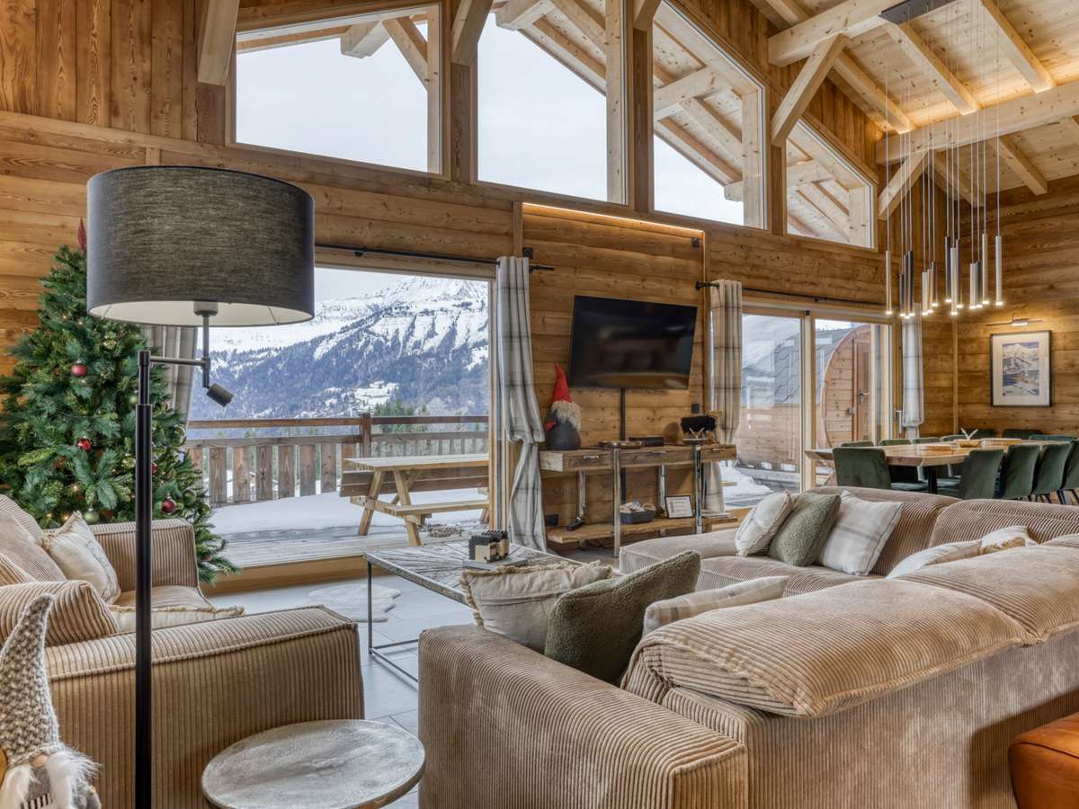 La pièce de vie lumineuse, dotée d'une belle hauteur sous plafond et de poutres apparentes, offre une vue imprenable sur le massif des Aravis grâce à ses larges baies vitrées.