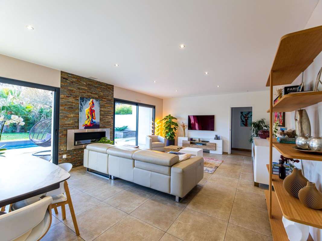 Au rez-de-chaussée, vous découvrirez une vaste pièce de vie baignée de lumière, ouverte sur le jardin et la piscine.