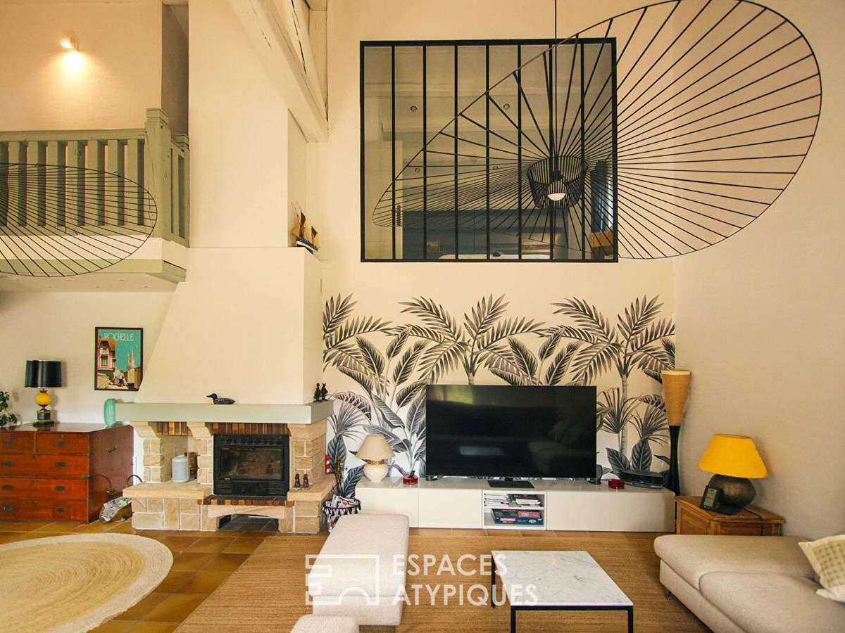 L'intérieur s'organise autour d'une vaste pièce de vie d'environ 55 m², baignée de lumière, où les volumes s'expriment pleinement grâce à une belle hauteur sous plafond.