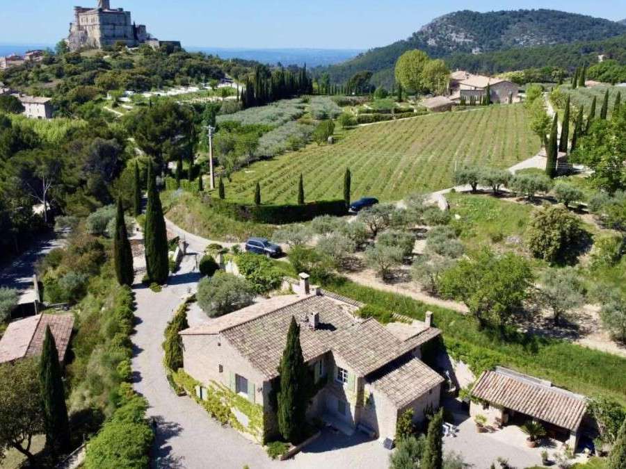 À quelques minutes à pied du village, la propriété développe environ 210 m² habitables et prend place sur un ensemble foncier d'environ 7 000 m², structuré en restanques et ouvert sur un panorama exceptionnel entre collines, garrigue, château du Barroux et Mont Ventoux.
