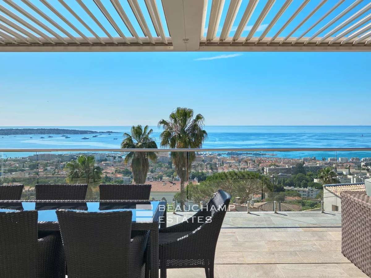 Exclusivité Beauchamp Estates.Située sur les hauteurs de Golfe-Juan, très belle villa moderne aux prestations de qualité offrant un superbe panorama sur la mer et le Cap d'Antibes.D'une surface de 202 m², elle se compose de la façon suivante:Au rez-de-chaussée : une entrée, un séjour, une salle à manger donnant accès à une terrasse avec vue mer de 40 m2, une cuisine entièrement équipée et arrière cuisine faisant également office de buanderie, une chambre de maître avec salle de bains en suite avec accès indépendant.Au rez-de-jardin : Deux chambres partageant une salle d'eau, une chambre en suite, un toilette séparé.Pour vos invités, un appartement type deux pièces.Terrain paysager d'environ 1068 m² avec piscine.Un garage pour deux voitures et des stationnements extérieurs pour 4 voitures.Classe énergie : C - Classe climat : A / montant estimé des dépenses annuelles d'énergie pour un usage standard : entre 1 720€ et 2 380€ (année de référence 2021).Les informations sur les risques auxquels ce bien est exposé sont disponibles sur le site Géorisques :
