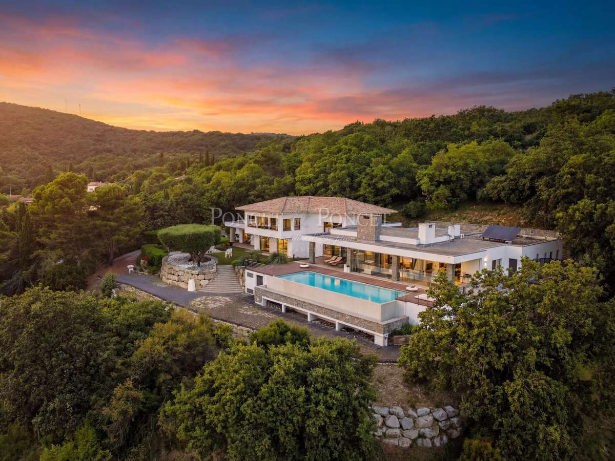 Sans aucun vis-à-vis, elle offre une atmosphère de calme absolu et des perspectives dégagées.L’entrée organise la villa en deux espaces indépendants, assurant une parfaite isolation acoustique et visuelle.Le hall central distribue, d’un côté, les volumes généreux dédiés à la réception, et de l’autre, la partie nuit garantissant sérénité et fonctionnalité.Une seconde entrée, dotée de nombreux rangements, renforce la praticité du lieu.Les Espaces de Vie:Le niveau principal s’articule autour d’une pièce de réception magistrale, magnifiée par des baies vitrées toute hauteur.Cet espace réunit un salon avec cheminée, un espace dînatoire et un salon.La cuisine américaine, signée Atelier de Saint-Paul, est sublimée par une cave à vin vitrée qui en structure l’ensemble.La terrasse principale, entièrement couverte, accueille une salle à manger avec barbecue ainsi qu’un salon supplémentaire.