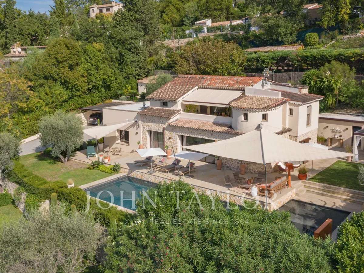 Elle bénéficie d’une vue panoramique sur le village de Mougins et les collines telle une oeuvre d'art !Entièrement rénovée avec des prestations haut de gamme, elle est équipée d’une vidéo surveillance, alarme et caméras, d’un portail électrique, et de climatisation réversible dans toutes les pièces principales.Baignée de soleil, la villa est édifiée sur un superbe terrain paysager de plus de 2 000 m².Elle totalise une surface de 263 m² composée comme suit : - un large salon-séjour-salle à manger avec cheminée à gaz ouvrant sur une magnifique terrasse avec accès direct à la piscine au sel, chauffée (17 mètres de long par 5 mètres de large), - 4 grandes chambres en suite.Au niveau piscine, un salon - salle à manger avec espace TV, deux chambres en suite complètes, des toilettes invités, une spacieuse cuisine entièrement aménagée et équipée.A l'étage, deux chambres complètes dont celle de maître avec terrasse et magnifique vue sur le village de Mougins.Un sublime espace pool house avec table à manger pour plus de 10 personnes, prolongé de sa cuisine d'été.Dépendances : une petite maison d’amis séparée de 25 m² avec sa terrasse et vue sur le village.