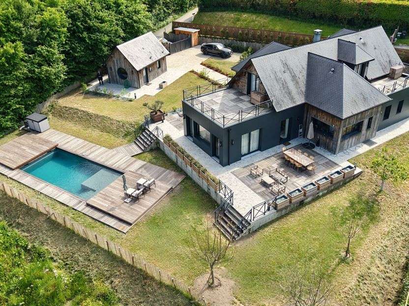 Pays d'Auge Sotheby's International Realty, vous présente à la vente, dans un environnement préservé, une très belle propriété contemporaine avec jardin paysager, jeux de terrasses, piscine extérieure, une dépendance aménagée en studio d'invités et des cabanons de rangements.