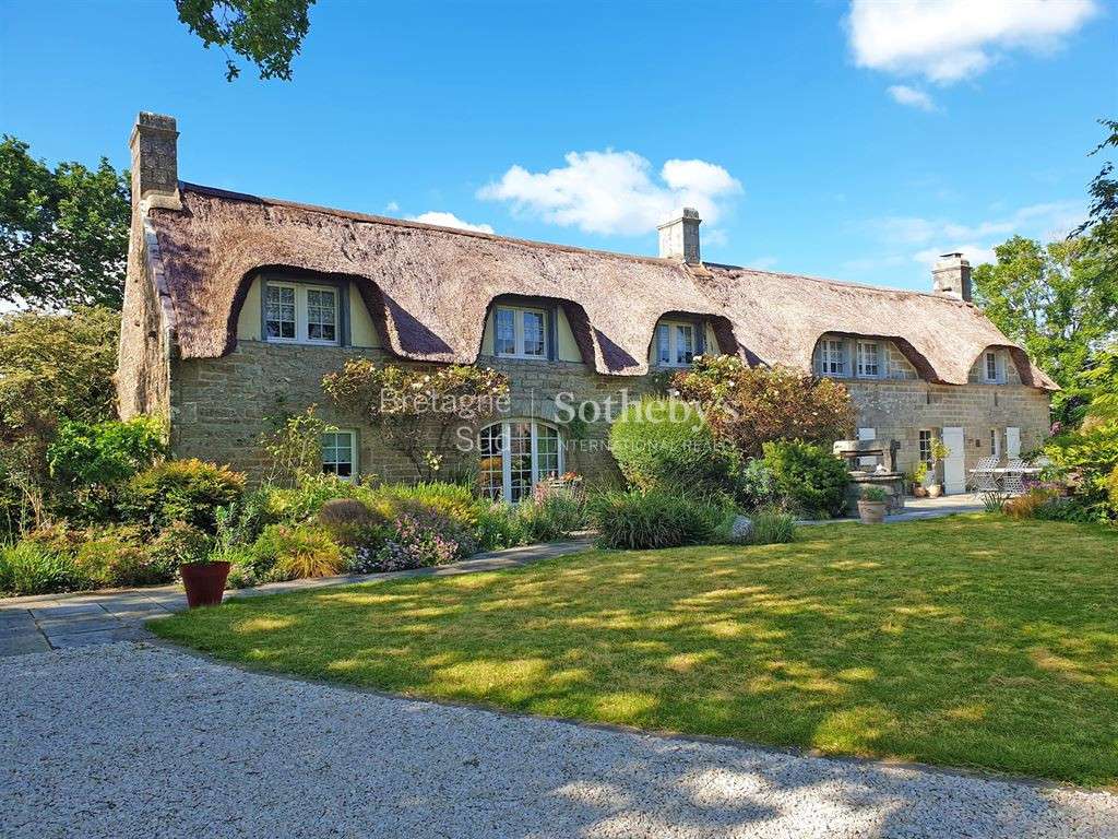 Elle comprend une confortable chaumière entièrement rénovée par un architecte avec des matériaux haut de gamme et ses trois dépendances en pierre et toit de chaume ou toiture ardoise.
