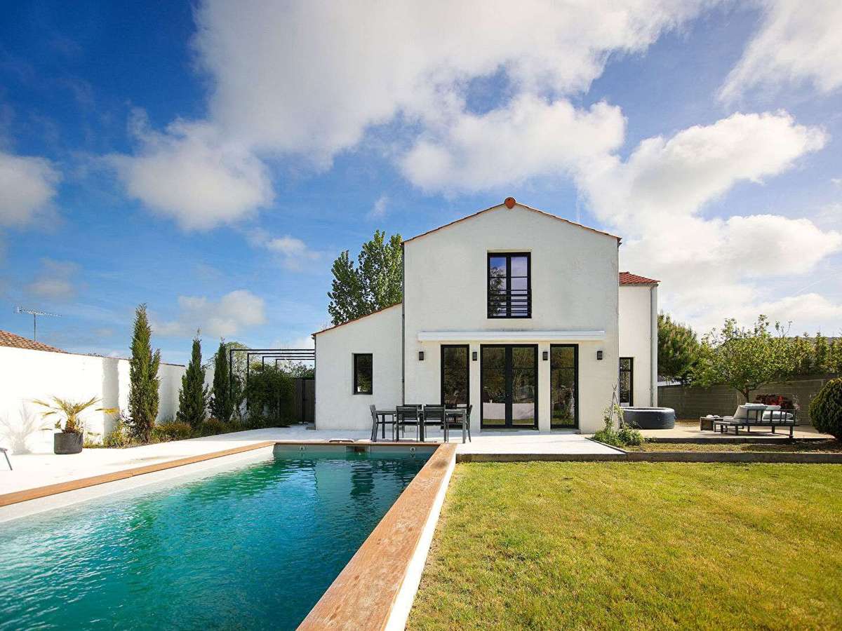 Située à Saint-Jean-de-Monts, en seconde ligne d'une impasse, cette maison contemporaine de 218 m² s'inscrit sur une parcelle de 1 100 m², offrant un cadre de vie intime et préservé.