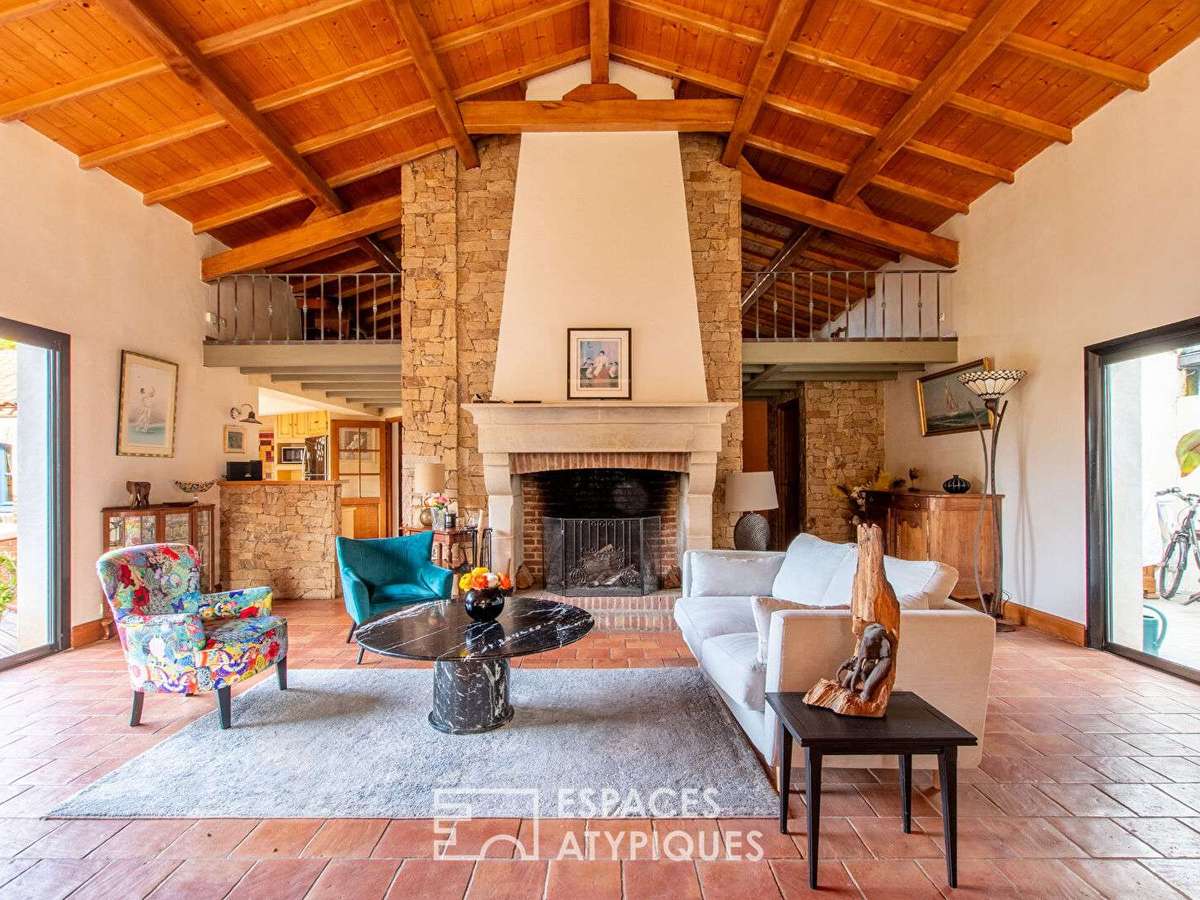 La lumière naturelle baigne le vaste séjour, sublimé par une cheminée et une belle mezzanine agrémentée d'une agréable terrasse couverte.