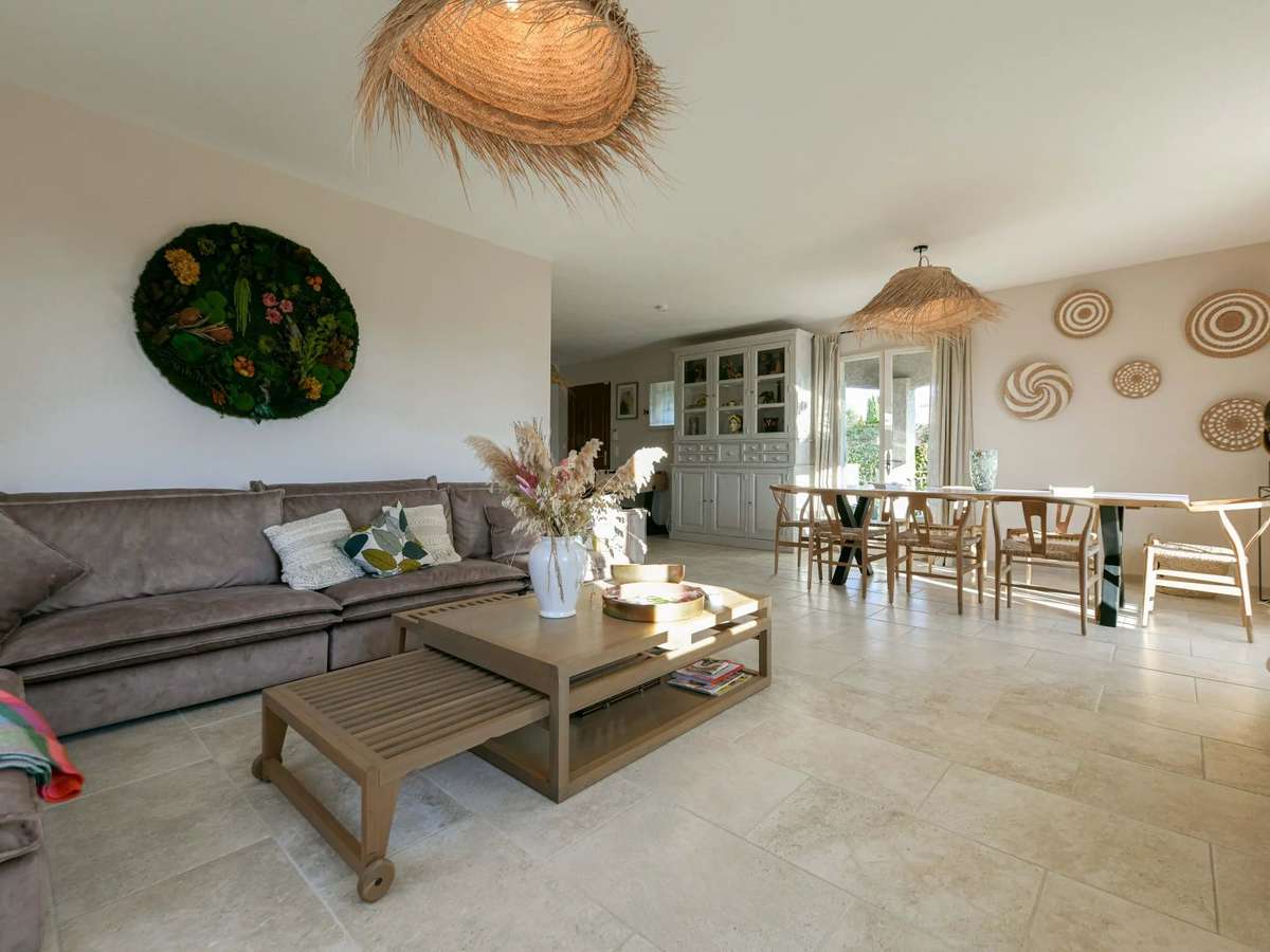 Belle pièce de réception de 50 m² ouverte sur terrasse et piscine 3 chambres, salle de bains, cuisine équipée Restauration totale 2023, belle parcelle plein Sud Garage, chauffage central et climatisations réversibles