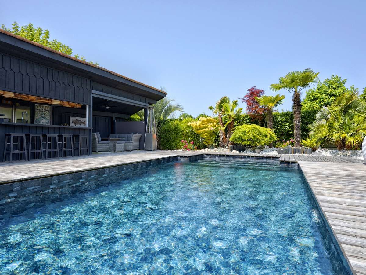 À l’extérieur, le jardin aux inspirations exotiques compose un écrin végétal particulièrement soigné. Piscine chauffée, jacuzzi, terrasses élégantes et pergolas bioclimatiques invitent à profiter pleinement des beaux jours dans un cadre intime et préservé.